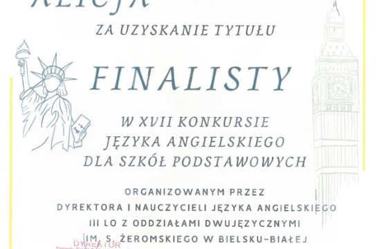 Miło nam poinformować, że uczennica klasy 7d Alicja uzyskała tytuł FINALISTY w XVII Konkursie Języka Angielskiego dla szkół podstawowych zorganizowany...