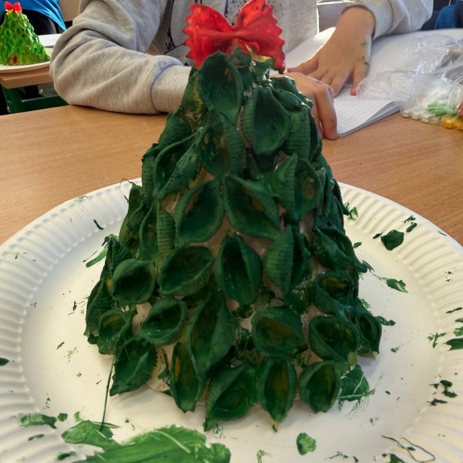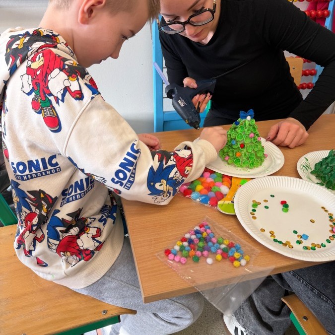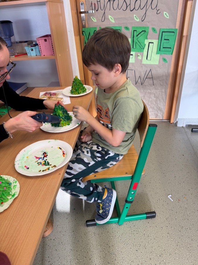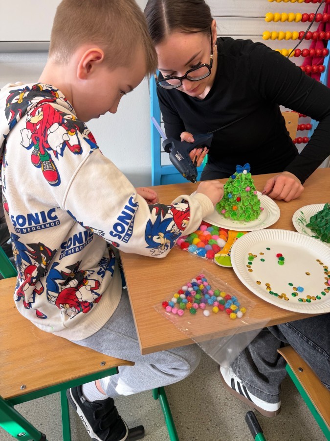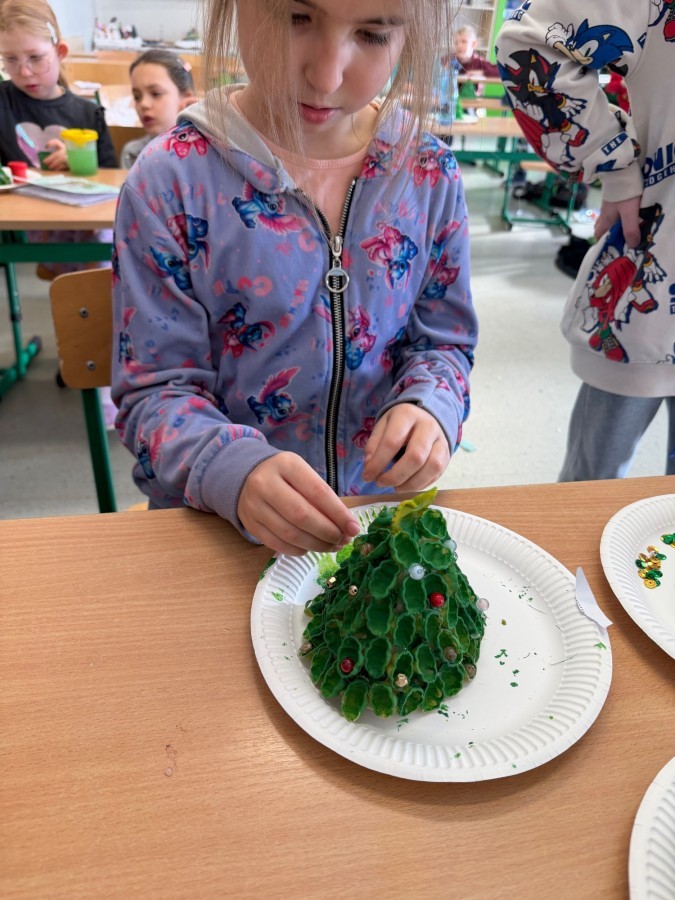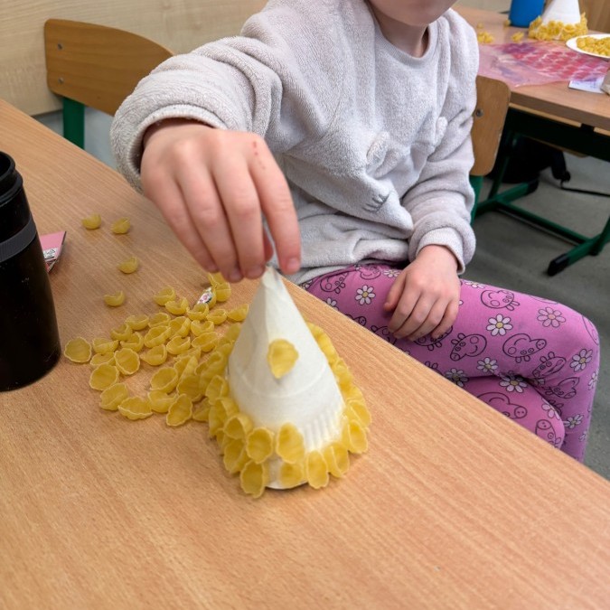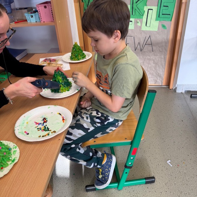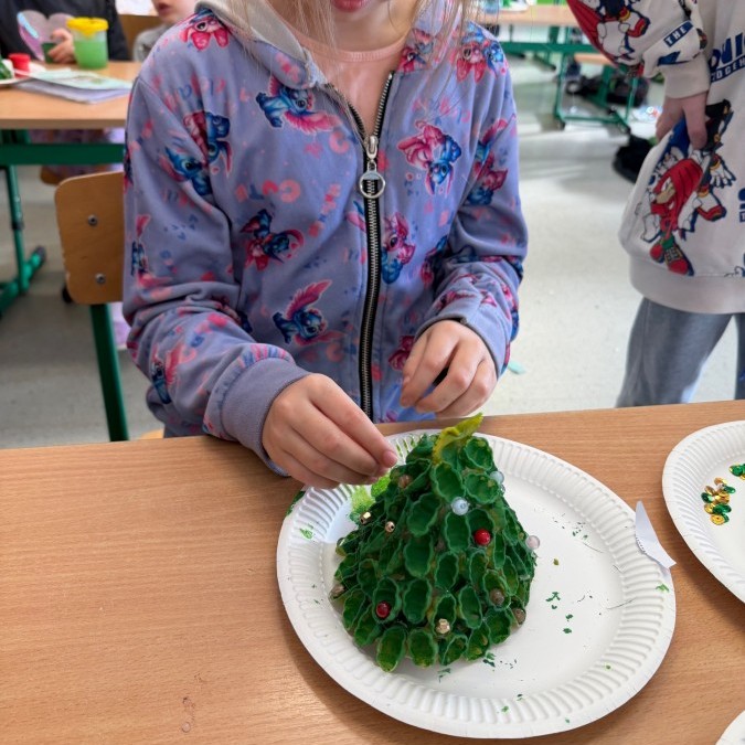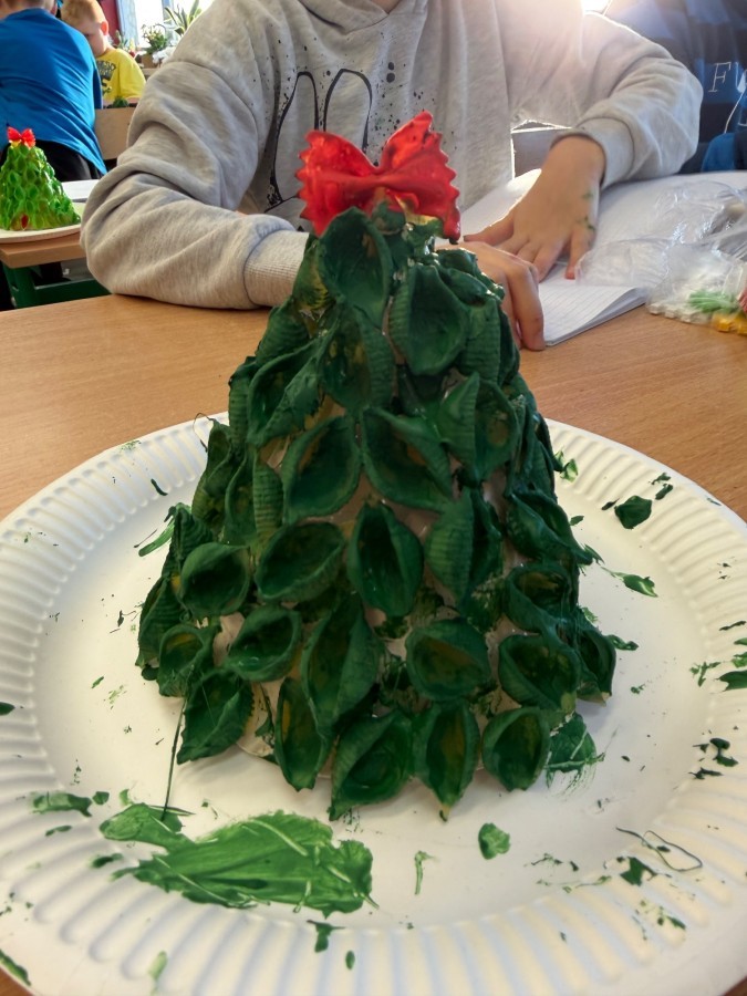 Tym razem w ich rękach zwykły makaron zamienił się w piękne, kolorowe choinki, które zachwycają pomysłowością i starannym wykonaniem. Dzieci pracowały z wielkim zapałem, ucząc się współpracy, cierpliwości oraz rozwijając swoje zdolności manualne.