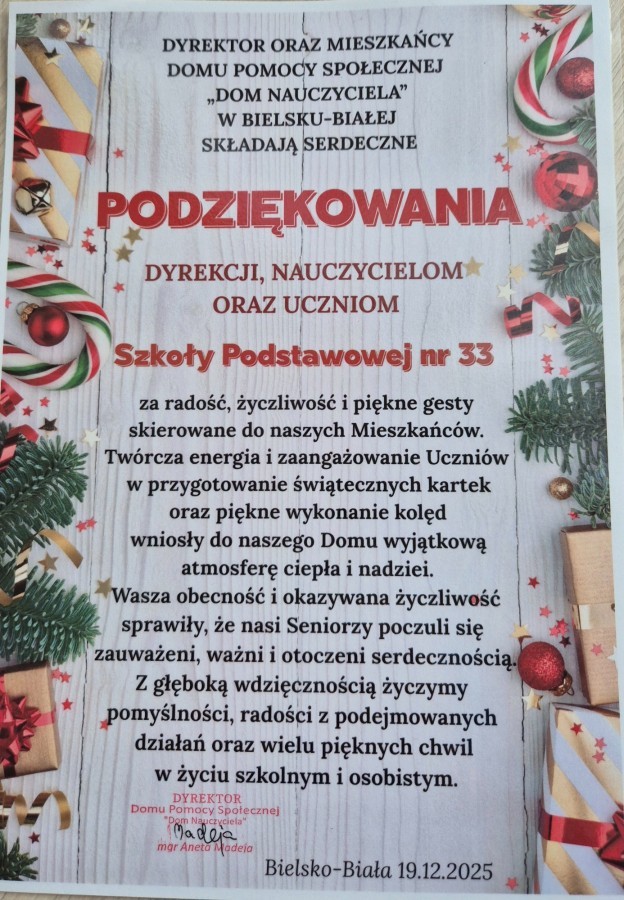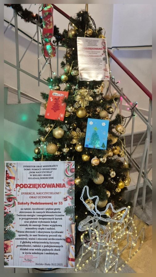 Serdecznie dziękujemy Dyrekcji, Nauczycielom oraz Uczniom Szkoły Podstawowej nr 33 za okazane serce, życzliwość i zaangażowanie. Wasza obecność, piękne gesty oraz świąteczne inicjatywy wniosły do naszego Domu atmosferę ciepła, radości i nadziei, sprawiając, że nasi Mieszkańcy poczuli się ważni i zauważeni.