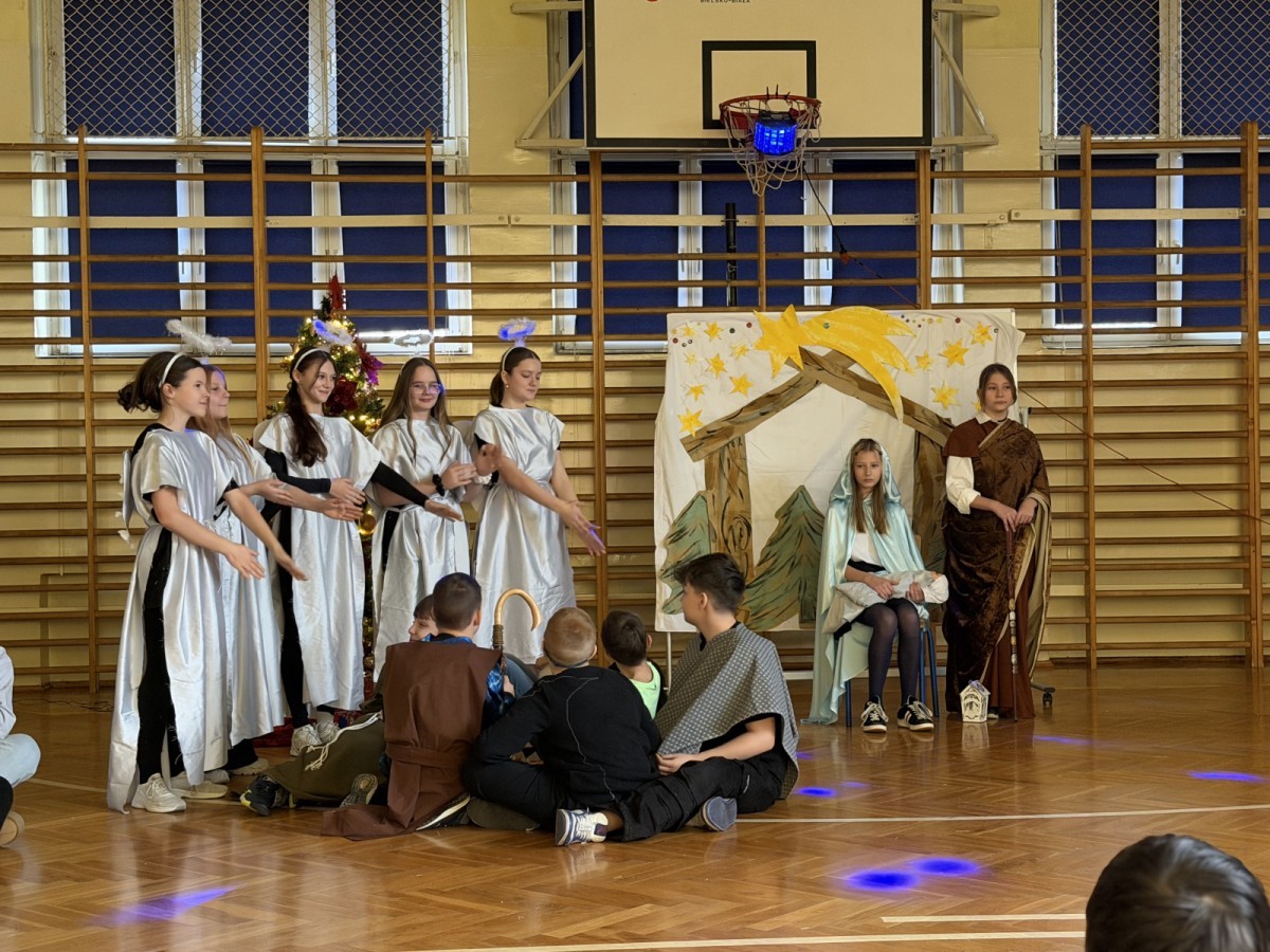 16 grudnia uczniowie klas V-VIII uczestniczyli we wspólnym kolędowaniu oraz obejrzeli jasełka przygotowane przez uczniów klas VI. Podczas świątecznego spotkania zostały rozdane nagrody dla klas, które najlepiej udekorowały salę w grudniu oraz zwyciężczyń konkursu piosenki świątecznej. Do występu przyłączyli się również nauczyciele, brawurowo wykonując utwór Skaldów "Z kopyta kulig rwie".